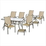 50100007 10 Piece Complete Tan Patio Set Enjoy entertaining outdoors this summer with our 10 Piece Patio Set. Complete with six chairs, two ottomans, a steel round glass top occasional table, and a rectangular glass top dining table, this set will be the perfect addition to any outdoor space. This set has a espresso metal finish, with a sandstone fabric. Features: -6-Steel/Textilene sling reclining chairs (28.75'' l X 21.75'' W X 37.75''h). -2 Steel/Textilene sling ottomans (22.75'' l X 21.25'' w X 11.75'' H). -1 Steel-round class top occasional table (20'' dia X 19''H). -1 Steel - rectangular glass top dining table (35.50'' l x 59'' w X 28.25'' h). Read more
