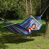 Color:Juniper Blue Aruba Hybrid Hammock The Aruba is our entry level hybrid polyester / cotton blend hammock. It is made of EllTex which offers superior protection from both UV and weather damage. It also features a very handy carrying case for taking your hammock along with you to the beach, the boat, or camping. Hang up an Aruba and you are ready for hammock season! Dimensions: 40' x 83' Weight Limit: 250lbs Read more