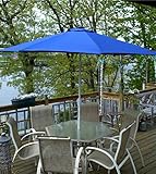 Large 10 foot Light Blue Market umbrella has Crank to open and close , plus solar charged Led Lights . Power supply for charging on cloudy days if necessary . An amazing product Read more