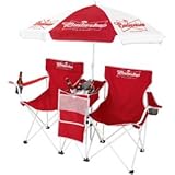 Relax in style – Budweiser style, that is! This lounge/cooler/umbrella set has it all – and it goes up in seconds flat! You get two comfortable, sturdy red fabric chairs (with mesh cup holders) imprinted with the Budweiser bowtie logo; a big, six-panel folding umbrella with the Budweiser bowtie logo on each panel; and an insulated cooler right in the center console keeps drinks handy – and cold. Console pocket holds loose items. And the whole thing fits easily inside the included carry bag. Each chair holds 250 lbs. Assembled unit measures 60" long. Read more